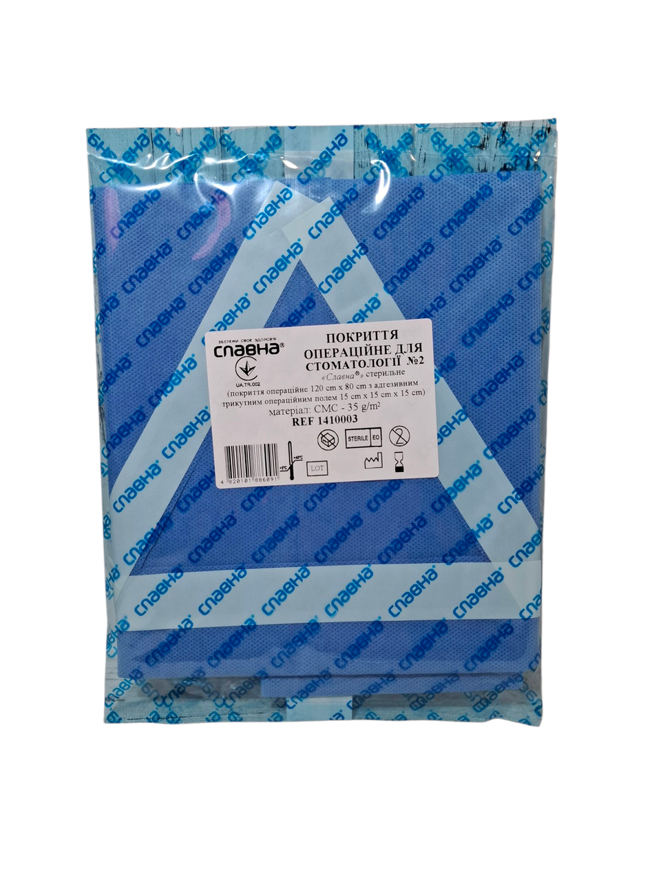 Покриття операційне для стоматології №2 «Славна®» (покриття операційне 120см х 80см з адгезивним трикутним операційним полем 15см х 15см х 15см (СМС - 35 г/м2)) стерильне